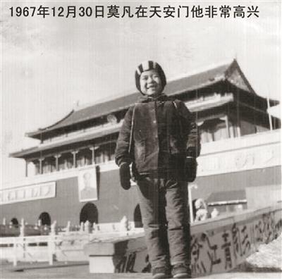 1999年国庆50周年时,莫凡的母亲徐慧远女士发来了他1967年6岁时在天安门前的留影,黑白照片上的莫凡,穿着厚厚的棉衣棉裤,戴着毛线帽子,笑得格外开心,仰拍的角度让这个站在天安门前的6岁孩子也显得高大起来。