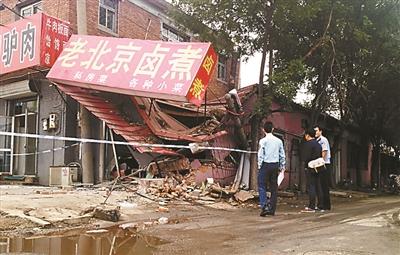 昨天上午,北京青年报记者来到事发现场。被大货车撞坏的卤煮店位于道路西侧,这家名为“老北京卤煮”的小店店面前半截搭出来的棚子几乎全部被撞塌。小店的红色招牌也塌了下来,靠在店铺的废墟上。店面门口的井盖上,依然留有一些已经干涸的血迹。