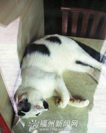 在临街的玻璃旁,店内桌上躺着一只猫。记者敲敲玻璃,它没有反应。一会儿之后,它偶尔动动四肢,抬起头看着记者。随后,它站起来,打了个哈欠,又躺了下来。