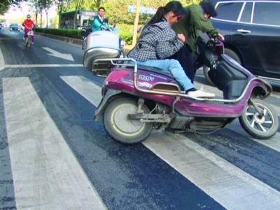 为了防止再有人摔伤,张先生把电动车横停在油污最多、最为湿滑的斑马线上,以此提醒其他过往车辆和行人注意。记者仔细观察,出现油污的路面集中在慢车道上,总共有几百米,这油是机油,有些地方积得很厚。远看上去好像这里刚下过一场雨在路面产生积水一样。记者把一张报纸铺在地上,很快大量的油渍就被报纸吸满了。