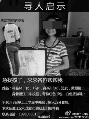 “妹妹小雅于10月8日早上上学途中失踪……家人电话:189805XXXXX,帮忙扩散。”昨日上午10时许,网名为“林啷个儿倩呀”的网友微博发帖求助。小雅父母昨日也将寻找范围扩大,“火车北站、火车东站都跑过了,还调了监控出来看,都没有找到。”