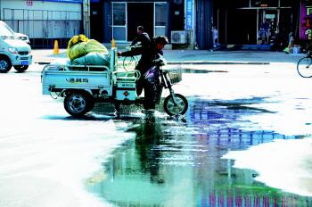 9日上午,记者来到了福成路与褔盈路交会的路口处。远远就能看见路口处有一大摊水迹,不断驶过的车辆还不时溅起一朵朵水花。现场闻到一阵阵的臭味。不少步行的市民只能一边观察,一边小心翼翼地经过,以防被行驶的车辆溅到。现场可以看到污水是从福成路南段西侧的两个污水井盖中流出来的,由于不断外流,在路口交会的地方更是形成了一条“小溪”。