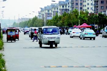 车辆在减速带前缓慢通过。 本报记者 王鸿哲 摄