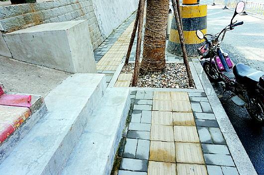 越过修车摊,蒙上眼睛,记者继续前行,耳边传来同伴的提醒:“这条路太窄,不足两米宽,前面有电线杆,有台阶,有树坑,要做好心理准备啊。”果然,没走几步,记者就差点撞到路灯杆上。路灯杆直接把盲道给截断了,杆子旁边就是台阶,只有狭小的空间可以通过。此时,一位路人好奇地问:“这是在调查盲道吗?这路太奇葩了,我们都不走,都在台阶上走,更别提盲人了。”