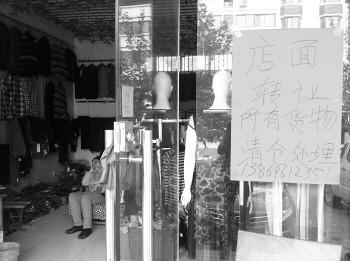石女士的“精品裤行‘门口已经挂出了处理货品转让店面的通知。 本报记者 赵松刚 摄