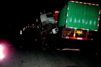 消防官兵到达现场后发现,一辆由南向北的红色集装箱货车占道与一辆由北向南正常行驶的绿色货车相撞,红色集装箱货车驾驶室撞到了绿色货车的车身部位。现场一片狼藉,到处是破碎的玻璃,红色集装箱货车驾驶室已近变形,驾驶室凹陷,红色集装箱货车司机被仪表盘和方向盘紧紧卡住,绿色货车上的人员并无大碍。