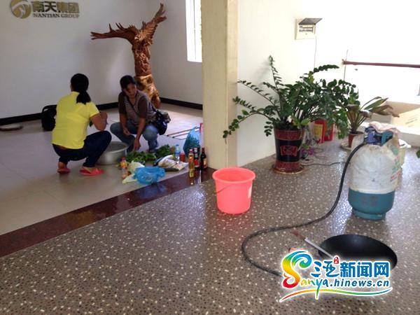 工人讨薪无果带着家人在开发商售楼部生火做饭(三亚新闻网记者 刘丽萍 摄)