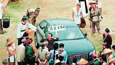 其中一个场景,在10多名“古代人”围堵下,再现了“我爸是李刚”的场景。网络截图