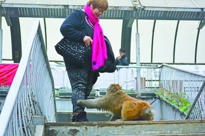 猕猴在天桥上向行人讨要食物。