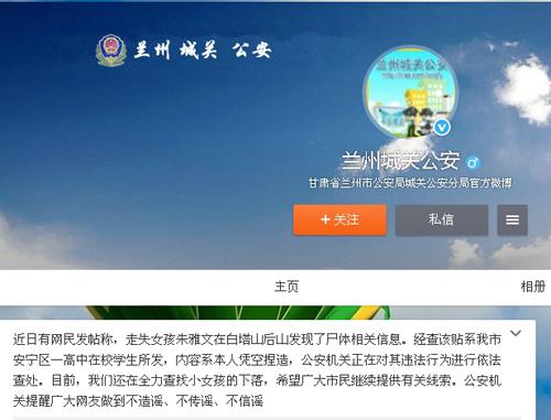 近日,有网帖称“甘肃走失女孩朱雅文在白塔山后山发现尸体”,该消息引发网友的热议和关注。昨日,兰州市公安局官方微博发布消息称,该帖系兰州市安宁区一高中在校学生所发,内容系本人凭空捏造,公安机关正在对其违法行为进行依法查处。