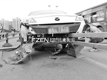 小车失控跨上护栏 前轮悬空“瘫”在桥面(图)