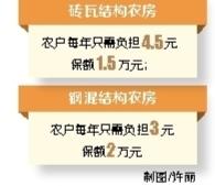 省财政厅、省民政厅与海南保监局近日联合下发的《海南省农房保险试点实施方案》要求,农房保险保费由财政提供60%的补贴,其余40%保费由农户自付。砖瓦结构农房,农户每年只需负担4.5元,保额1.5万元;钢混结构农房,农户每年只需负担3元,保额2万元。而对于没有实行集中供养的农村五保户,保费100%由政府承担。