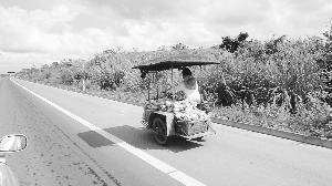 刚上到海屯高速公路不久,记者就在5公里至6公里处,发现从海口往屯昌方向,有多辆农用拖拉机在行驶,其中有两辆未挂牌照。从屯昌往海口方向,则有10多名“驴友”骑着自行车在高速公路应急车道上行驶,还有一辆小车随意停在应急车道,驾驶员下车拍摄风景。在此过程中,有辆无牌越野小车飞速从记者乘坐的越野车旁超车而过,因其以超过120公里的时速行驶,跟随的记者只能望尘莫及。