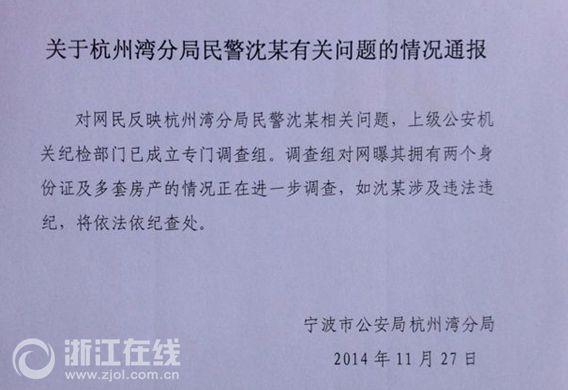 宁波市公安局杭州湾分局在通报中称,对网民所反映的杭州湾分局民警沈某拥有大量房产等问题,上级公安机关纪检部门已成立专门调查组,相关情况正在进一步调查,如沈某涉及违法违纪,将依法依纪查处。(浙江在线记者/俞雯祺 编辑/赵洁)