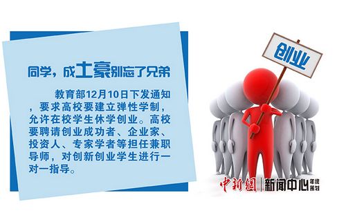 李克强总理说,要在中国掀起大众创业草根创业的新浪潮。也许你还耽于“唯有读书高”的传统思维,不过你也可以创业学业两不误。教育部12月明确提出,高校要建立弹性学制,允许在校学生休学创业,加大对他们的资金支持。