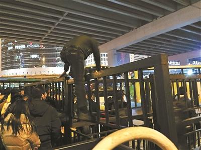 昨晚,国贸公交枢纽处等车的乘客排起长队,有乘客等不及翻栏杆插队 摄影/金叶