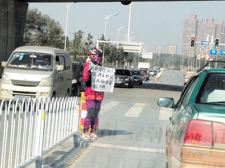 昨日中午时分,在晚报大道与浏阳河路交会处的一个红绿灯前,一名女子站在路中间的护栏边,举着一张很大的硬纸,向过往的车辆乞讨。记者走近一看,发现纸上写着“一路骑行,水尽粮绝,请求帮助,筹钱吃饭和备些路上干粮”,偶尔有停车等红灯的车主会给钱。记者注意到,女子一身红色骑行服,但整个脸被围巾包得很严实,只露出一双眼睛。看到记者拍照,她下意识地将硬纸卷起来,掉转头避开记者。