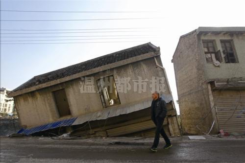 浙江乐清一临河民房突倾斜下陷 倾斜角度30°(图)