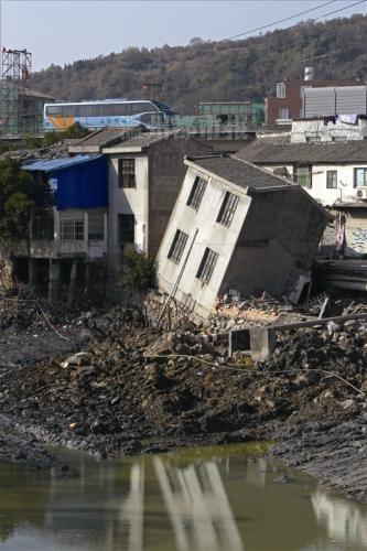 图为下陷的民房。