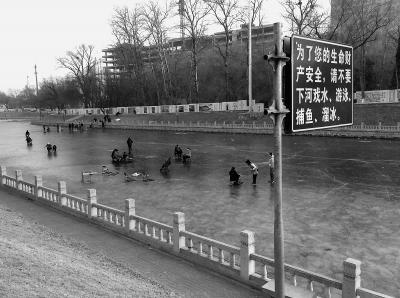 在河道的南北两侧,各有一块大牌子,提醒人们不要滑野冰。记者看到,靠近南北两侧岸边的河面上,冰层冻得并不结实,很多地方还都是水汪汪的。但这些区域并没有明显标志,经常有人滑着冰车打这儿经过。