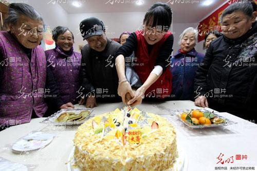 2014年12月30日,在合肥市蜀山区荷叶地街道居家养老工作站,工作人员方芳(右四)和老人们一起切蛋糕,共同欢迎2015年新年的到来。陈三虎摄/光明图片