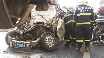 经过十多分钟的努力,终于将被困的司机营救了出来,但经过医生检查,司机因伤势过重,已经死亡。站在一旁的货车司机沈师傅称,自己是外地车,早上从南京拖货准备送往不远处的六合葛塘。上午9点多,自己的大货车行驶到事发地段的这处马路上时,突然发生故障,只得停在快车道上。因货车装载了一车厢较重的货物,没法向边上停靠。沈师傅下车后,为了确保后方来车的安全,他在车厢尾部不远处设了一个警示标志,还找来一个更醒目的黄色塑料桶摆在后面,随后自己就到附近修理厂找修车的师傅来。但没想到,自己回来一看,这辆南京牌照的面包车撞到了他货车的尾部,他吓得赶紧报警。目前,当地警方正在对事故原因及责任作进一步的调查。 (记者 梅建明)