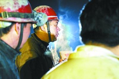 凌晨气温低至0℃,救援人员喝开水驱寒。