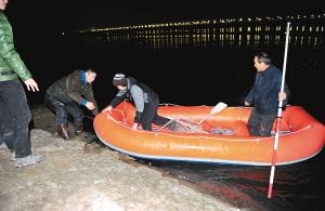 7日晚,因天黑且水流太急,志愿者们返回河岸 记者 翟小雪 摄