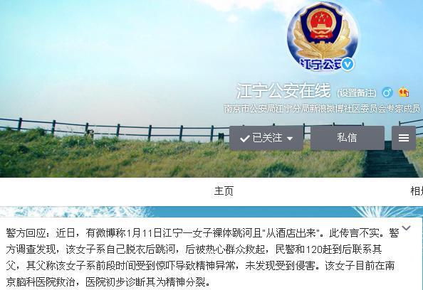 昨晚,南京市公安局江宁分局官方微博回应:此传言不实。警方调查发现,该女子系自己脱衣后跳河,后被热心群众救起。民警和120赶到后联系其父,其父称该女子系前段时间受到惊吓导致精神异常,未发现受到侵害。该女子目前在南京脑科医院救治,医院初步诊断其为精神分裂。