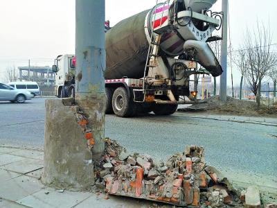 昨天下午,记者在槐房西路与通久路交口处找到了被撞坏的路灯杆。记者看到,这根路灯杆位于路口东侧,其顶部架有3根线缆,路灯杆底部用水泥砌成的防撞墩有一半已经被撞得粉碎,碎石块滚落在马路边上。
