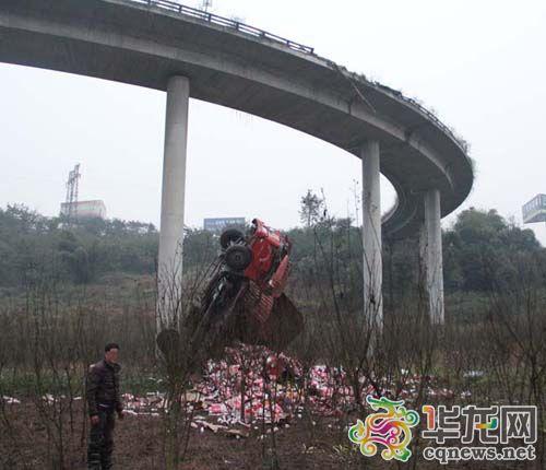 货车坠下近30米高匝道桥 驾驶员仅受轻伤(图)
