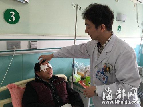 医生正在查看孙先生眼球内的积血