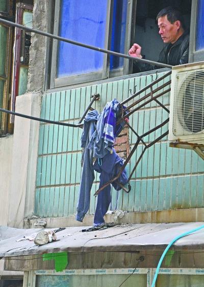4楼晒衣架被坠楼的刘女士撞弯,雨阳棚上留有她的一只鞋。记者杨涛 摄