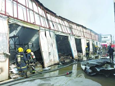 昨天上午,记者赶到事发现场看到,一栋单层彩钢板结构库房的相邻5个门面已被烧成空架,黑烟滚滚,空气中弥漫浓重的刺鼻气味,库房内一片狼藉,只剩一堆堆焦黑的铁渣。库房外围已拉起警戒线,10余名消防队员仍手持水枪向库房内喷洒,避免火场复燃。