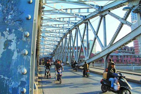 下图为 钢结构的浙江路桥始建于1908年,至今已有107岁,只比外白渡桥年轻一岁,是我国乃至亚洲唯一一座仅存的鱼腹式钢桁架桥梁。当时的桥上铺设单轨,通行英电5路、6路有轨电车。 ■记者 李蕾 记者 张海峰 摄