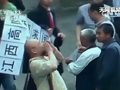 目击者(殷先生):(记者:当时现场乱不乱?)现场围观的多,他们就在这里举着个牌子,骂些脏话。(记者:一些什么样的牌子啊)就是易拉宝,两米高,六十多公分宽。(记者:上面是什么样的图案?)可能是法院领导的图案。