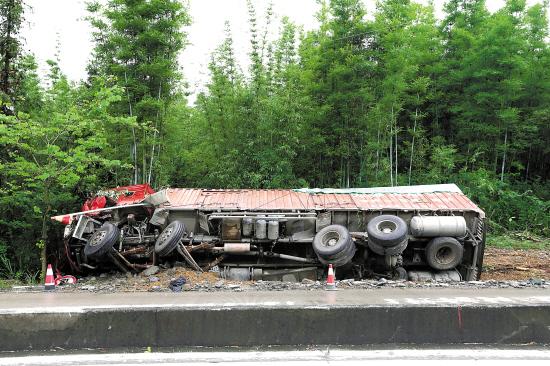 当晚白色货车在救援时已被拉走,而两辆大货车还在现场等待处理。江西籍大货车在碰撞了白色货车后,向右侧翻滑行,在路边绿化带留下了一条近20米的痕迹。而湖南籍重型自卸货车则停在道路的西侧车道上,车头朝南。前窗玻璃分成两截,掉落在路旁的水泥墩上,保险杠也被撞掉。其前轮还压着白色货车的一截护栏。车前地面上散落着单只胶鞋、折断的头盔、手套等杂物,怀疑是从白色货车上掉落的。直至下午3时30分,两台货车还未被清离现场。