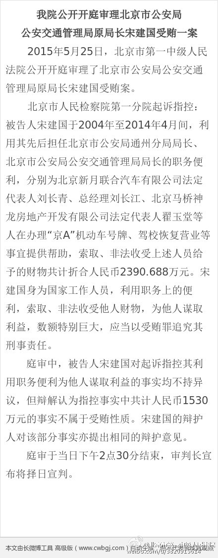 中新网5月25日电 据北京市第一中级人民法院官方微博消息,北京一中院今日公开开庭审理了北京市公安局公安交通管理局原局长宋建国受贿案。庭审于今日下午2点30分结束,审判长宣布择日宣判。