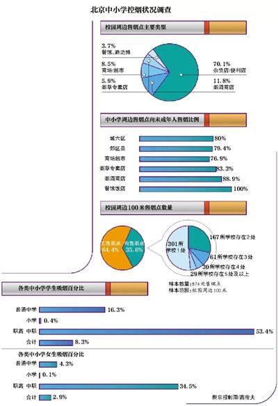 昨天,北京市疾控中心公布《北京市中小学校控烟环境调查报告》显示,超三成校园周边百米内有售烟点,最多的超过11处,且80%向未成年人“开放”。调查还发现,现北京中小学男教职员工吸烟率超过三成,中学女生吸烟率现上升趋势。