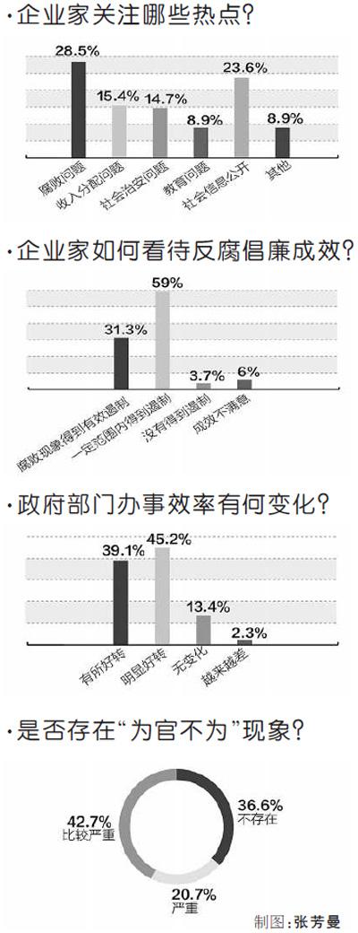 近日,河南省纪委与省工商业联合会在128名民营企业家中进行了专题调研,问卷调查显示:90.3%的民营企业家对现有反腐败工作表示支持,认为腐败现象得到了遏制;84.3%的民营企业家认为持续推进反腐败,政府办事效率有明显好转或有所好转,特别是在行政审批效率上有明显改善。