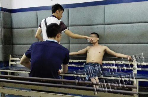 昨日上午,灵秀派出所对犯罪嫌疑人唐某进行审讯,唐某赤裸着上身,坐在审讯室内,一副事不关己的样子。当民警问他为何砍人时,唐某一副仍在醉酒的样子,声称自己只是喝酒并没有伤人,而面对其砍人的事实,他也只是一再回答什么都不记得了。