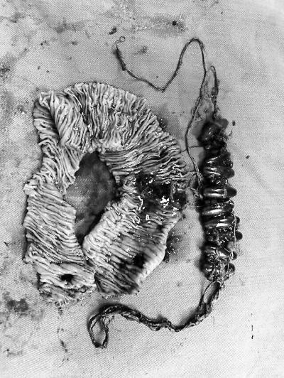 当天手术时,黄鹤光发现,小兵吞下的是磁铁手链,大小串在一起,小的像圆珠,大的像橄榄,直径近1厘米,长约2厘米多。这些磁铁紧紧地吸在一起,将一段弯曲的小肠夹在中间,已磨破了2个洞,约硬币大小,部分区域的组织已坏死。