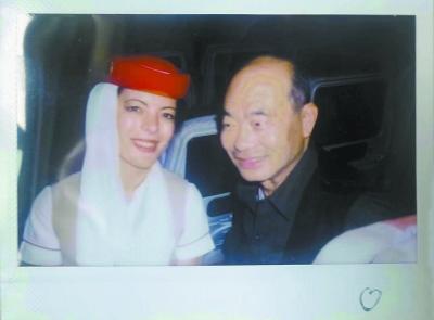 成功救助患病乘客后,空姐高兴地与张津生合影。