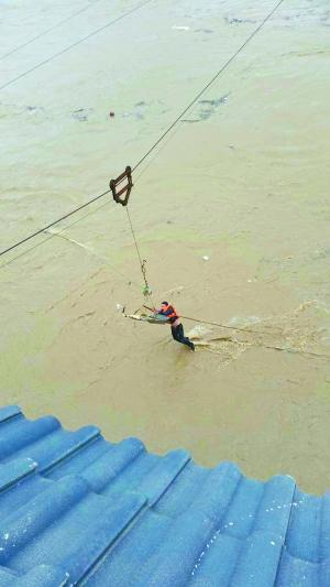 值班员将铅鱼通过索道遥控到河流中间,漂流至此的李光进看到后,伸手将其抓住。