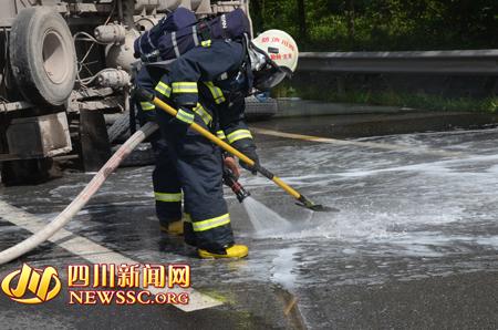 为避免发事态进一步扩大,消防官兵立即带上防毒面具并用水枪对泄露胶水进行稀释,用铲子将凝固的胶水用高压水枪稀释并用泥土拌稀进行清理,在经过近一小时的处理后,险情才得以消除,交通恢复正常。