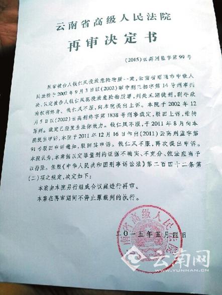 杨柱说,今年6月11日,钱仁风从监狱里给他打来电话说,省高院再审此案的法官到监狱里看望了她,并给她送去了再审决定书。听得出钱仁风语气很轻松。