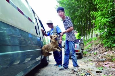 志愿者小顾(右)将救出的狗转移到安置地 摄/法制晚报记者 刘畅