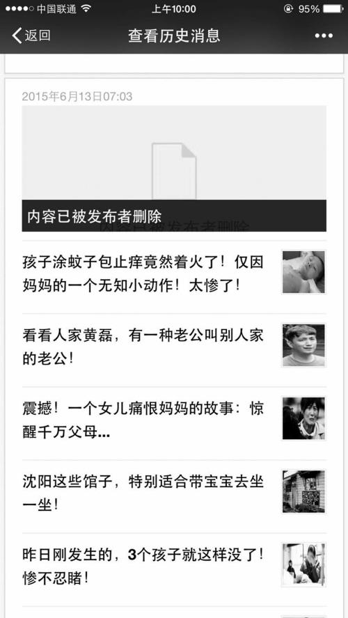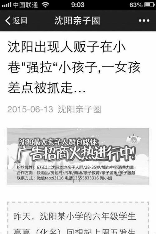沈阳晚报、沈阳网记者通过搜索,对该微信公共账号进行添加,看到了6月13日7点03分发布在头条上位置上的帖子已被删除。记者找到了一位转发过此消息的一位孩子妈妈,她提供了当时的截图。