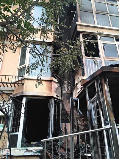 昨日下午,北京太阳城小区,69号楼前围着白色栅栏,整栋楼的南侧墙面被烟熏黑,一楼到三楼南侧的玻璃破碎,一层起火的房间内一片漆黑,桌椅、电扇等家具散落在外。