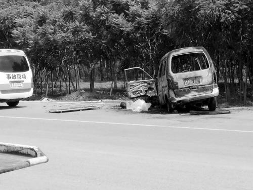 6月22日12时许,浑南区南堤东路上发生一起交通事故,一辆由西向东行驶的面包车突然起火。当沈阳晚报、沈阳网记者赶到现场时,这辆面包车停在路边,车身过火,已经烧成了框架。路边的一个指示杆被撞得连根拔起。拖车、96144殡葬车和公安车也在现场,一个人躺在车下,身上已经被烧焦成黑炭状。据了解,当时车内共有三人,120到来时车内的两个人还有生命迹象,被送到医院急救了,而司机却被烧死在车里。